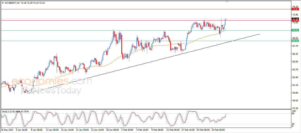 Цены на нефть марки Brent укрепили свой резкий рост в ходе последних внутридневных торгов, преодолев ключевое сопротивление на уровне 72,00 долларов, воспользовавшись появлением позитивных сигналов от индикаторов относительной силы, несмотря на достижение уровней перекупленности, при этом динамическая поддержка, представленная торгами выше EMA50, сохраняется на фоне доминирования основного бычьего тренда в краткосрочной перспективе.