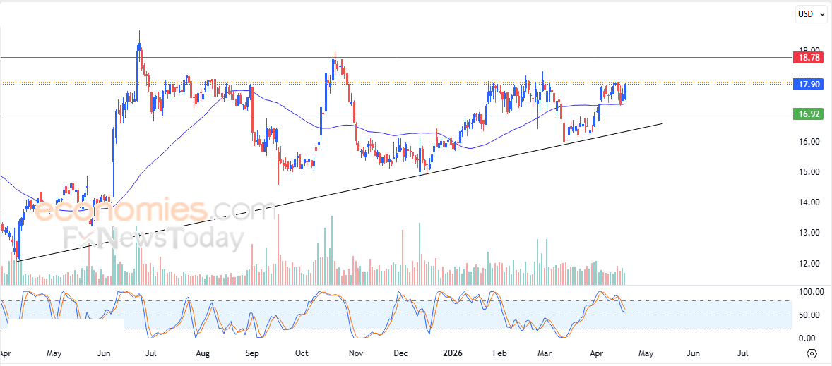 Таким образом, мы ожидаем роста цены акций в ходе предстоящих торговых сессий, если уровень поддержки на отметке 16,90 останется неизменным, ориентируясь на ключевой уровень сопротивления на отметке 18,75.