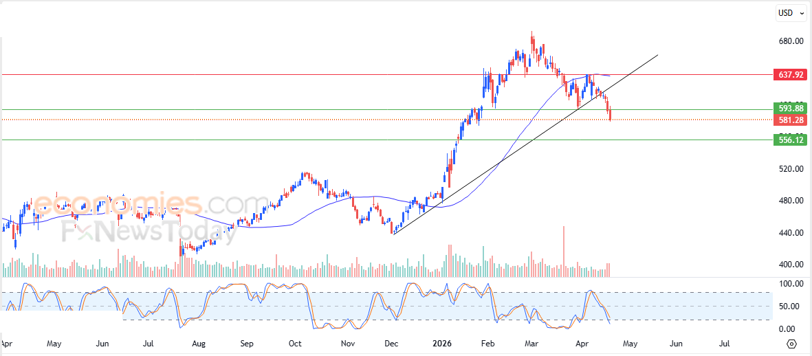 Таким образом, наши ожидания указывают на снижение цены акций в ходе предстоящих торговых сессий, особенно если она останется стабильной ниже отметки 594,00, ориентируясь на следующий уровень поддержки в 556,00.